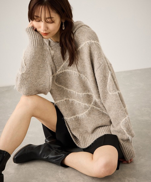 ふんわり暖かく、抜け感も叶える大人のシャギーニットパーカー。【素材感】・膨らみと温かさのある程よい肉感ながらとても軽いスポンディッシュな編み地がポイント。・質感の違うフェザーヤーンを使用したアートラインでより立体感を演出。【デザイン・シルエット】・ゆったりとしたカジュアル感のあるオーバーサイズシルエット。・ジャスト丈にすることでコーディネートしやすいバランスに。・カジュアルながら女性らしい抜け感を叶えるフーディーデザイン。・質感の違う糸で丸みのあるアートラインをリンキングすることでより印象的に。【カラー】・チャコールとベージュの2色展開。・カジュアル感のあるメランジカラー。【スタイリングポイント】・ポリエステルとレーヨン混のキレイめボトムに合わせると抜け感のあるコーディネートに。・レザー系の質感の違う素材合わせだとコーディネートにメリハリがプラスされる。・デニムパンツ+スニーカーで抜け感のあるデイリーコーデ。・ロングプリーツスカート+ブーツの女性らしいスタイルもおすすめ。-----------------------------裏地:なし光沢感:なし透け感:なし伸縮性:ありファスナー:なしポケット:なしボタン:なし生地の厚さ:やや厚手季節:秋、冬-----------------------------※撮影時の光、お使いのモニター環境によって色の見え方が違う場合がございます。【モデル着用サイズ】モデル(ロングヘア)身長:165cm 着用サイズ:Fモデル(ボブヘア)身長:166cm 着用サイズ:F