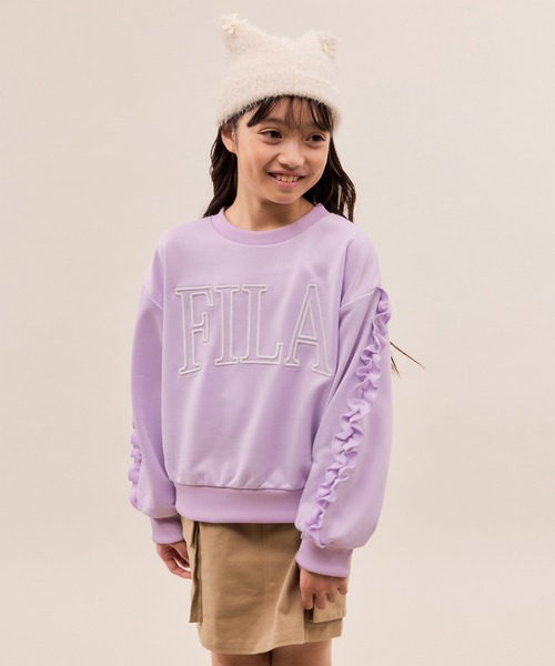 【FILA/フィラ】別注カラーあり。袖のフリルがアクセントのなったスウェットトップス。【素材感】 ・厚すぎない裏毛素材で、秋から春先まで快適に着られる万能スウェット。 ・ネックや袖口には柔らかいリブを採用し、動きやすく着心地も快適。 ・デイリーに使いやすく、洗濯もしやすい子供服に嬉しい素材感。 【デザイン・シルエット】 ・フロントには存在感のある大きめ【FILA/フィラ】刺繍ロゴを配置。 ・刺繍は【FILA/フィラ】オリジナルデザインを変更した別注デザイン。 ・袖にフリルをあしらい、スポーティさにガーリーな可愛さをプラス。 ・程よくゆとりのあるシルエットで、通学や遊びにも安心の着やすさ。 【カラー】 ・(01)ブラック→刺繍カラーチャコール。 大人っぽくスタイリッシュに着られる、定番のブラックカラー。 ・(53)ラベンダー→刺繍カラーホワイト。 女の子に人気のラベンダーは、ロペピクニック別注の特別カラー。 ・2色展開で、カジュアルにもガーリーにも対応できる万能カラー展開。 【スタイリングポイント】 ・カーゴミニスカートと合わせて、今っぽいスポーティガーリーコーデに。 ・セミフレアパンツと合わせれば、大人顔負けのスタイリッシュな着こなしに。 ・デニムやスニーカーを合わせて、休日のお出かけにぴったりなカジュアルスタイル。 ----------------------------- 裏地:なし 光沢感:なし 透け感:なし 伸縮性:ややあり ファスナー:なし ポケット:なし ボタン:なし 生地の厚さ:普通 季節:春、秋 ----------------------------- ※撮影時の光、お使いのモニター環境によって色の見え方が違う場合がございます。 【モデル着用サイズ】 身長:125cm 着用サイズ:130