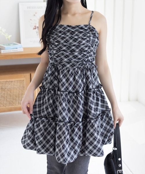 ふんわりシルエットで主役級!シャーリングティアードバルーンワンピース【デザイン】ギャザー×チェックが印象的なバルーンワンピース。裾にかけてふわっと広がる立体的なフォルムが着るだけで映える!アジャスター付きなので調整可能!またインナー次第でロングシーズン使えるのも嬉しいポイントです♪【素材感】着心地の軽いポリエステル素材伸縮性:なし/ 透け感:なし/ 裏地:あり 手洗いによる洗濯可 / ドライ・ウェットクリーニング可【コーディネート】タートルニットをINしてレイヤードでの着まわしが自由自在です!カーデやシャツを羽織ってカジュアルダウンも◎足元はブーツで甘辛に、スニーカーで抜け感をプラスすることもできます。【※お取り扱い上のご注意】1:モニター環境等により実際の商品と多少色味が異なって表示される場合がございます。予めご了承下さい。2:屋外で撮影された商品は、天候により多少実際のカラーと異なる場合があります。商品のカラーはトルソー(マネキン)の商品画像をご参照ください。3:濃い色の商品は、お洗濯や摩擦等による移染にご注意ください。4:末永くご愛用頂く為に、アテンションタグ・洗濯ネームを必ずご確認の上、着用又はお取り扱い下さい。5:生産時期により、色、サイズ、デザイン、素材の質感が多少が異なる場合がございます。あらかじめ御了承下さいませ。