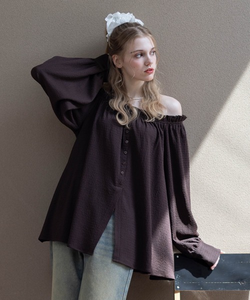 気分で変えれる!フロントボタン2way楊柳ブラウス【デザイン】軽やかな楊柳素材が魅力のブラウス。首元はゴム仕様になっており、肩を出してオフショルに肩を上げてきれいめネックラインにと、2wayで楽しめます。前立てのボタンがさりげないアクセントに。ふんわり広がるシルエットと袖口のギャザーが女性らしいやわらかな印象をプラスしてくれます♪【素材感】着心地の軽いポリエステル素材伸縮性:あり/ 透け感:なし/ 裏地:なし /オフショルゴム:あり 手洗いによる洗濯可 / ドライ・ウェットクリーニング可【コーディネート】デニムと合わせればカジュアルにロングスカートやスラックスと合わせればお仕事やお出かけにもぴったり。オフショルにして華やかなアクセサリーをプラスすれば一気にドレッシーな雰囲気に。季節やシーンに合わせて着こなしの幅がぐっと広がる1枚です!【※お取り扱い上のご注意】1:モニター環境等により実際の商品と多少色味が異なって表示される場合がございます。予めご了承下さい。2:屋外で撮影された商品は、天候により多少実際のカラーと異なる場合があります。商品のカラーはトルソー(マネキン)の商品画像をご参照ください。3:濃い色の商品は、お洗濯や摩擦等による移染にご注意ください。4:末永くご愛用頂く為に、アテンションタグ・洗濯ネームを必ずご確認の上、着用又はお取り扱い下さい。5:生産時期により、色、サイズ、デザイン、素材の質感が多少が異なる場合がございます。あらかじめ御了承下さいませ。