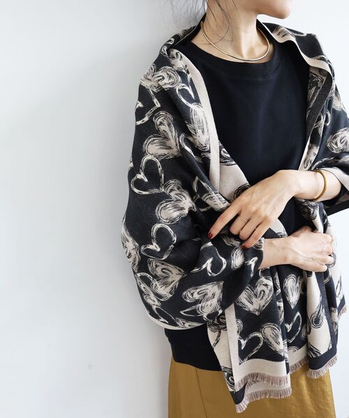 《WEB限定アイテム》 薄手で柔らかい大判ストール さらっとした素材で肌当たりも◎ 大判なのでマフラー巻きはもちろん、さっと羽織るように使ったりひざ掛けなど幅も広がります。 ドット柄とハート柄の2柄をご用意しました。 派手さのないモノトーン使いでさりげないアクセントにピッタリです。