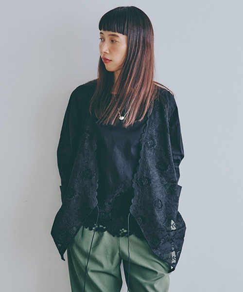 コーデに取り入れて新鮮なスタイルに華やかな印象のカシュクールジレーーー【素材】立体感のあるレース素材を使用。程よい透け感で一枚着としてもインナーとしてもご着用いただける素材感です。【デザイン】立体感のあるレースが目をひくカシュクールジレ。暑い時期はインナーと合わせてノースリーブブラウスとして、秋口から冬にかけてはシャツやニットのインナーとして。新鮮なスタイルが叶うだけでなく、長い期間使える魅力的な一枚です。トップス ジレ ベスト レースーーー【スタイリング】暑い今の時期はタンクトップやノースリーブトップスと合わせていただくのがおすすめ◎秋口から冬にかけてはシャツやニットのインにもお使いいただけます。脇で結ぶカシュクールやフロント部分で紐を結ぶ着こなしなどアレンジもお楽しみください。※内側の紐はループに通して固定してください。