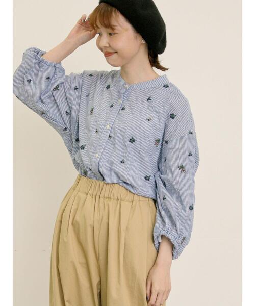 細やかな花柄刺しゅうが可愛らしいアクセントになるシャツ。首元はバンドカラーになっており、スタイリングにすっきりとした印象を与えます。肌触りの良いコットンベースの生地が魅力。季節の変わり目のお出かけシーンに大活躍するアイテムです。※商品画像は、撮影環境やお客様のご利用のPC・スマートフォンのモニター環境などにより実物と色味に差異がある場合がございます。