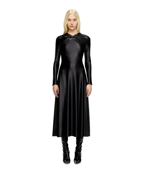 メタルオーバルDをよりエレガントに表現した新型ドレス「D-IAMO」。生地の光沢感と、同系色のシャイニーなオーバルD、ツイストのディテールがほどよくミックスされたバランスの良い仕上がりとなっています。ナイロンベースの生地で仕立てた、抜群のストレッチ性も特徴のひとつ。ウエストから裾にかけて広がりと落ち感があり、上品さも併せ持った一枚になっています。
