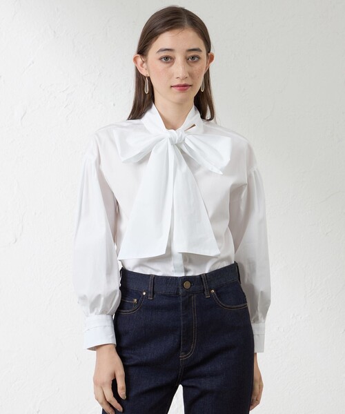 武川英子氏監修、エスプリのあるスタンダード白ブラウス【デザイン】衿に大きなボウが付いた印象的な白ブラウスです。THOMAS MAISONという綿のシャツ地で有名なファブリックメーカーの素材を使用しています。「シーズンの立ち上がりには絶対白のシャツとデニム」という初代ディレクターである武川英子氏のエスプリを大事に作った特別なブラウスです。お勧めの着方は、ボウの輪が15cくらいの大き目の輪にしてリボンを下側に垂れるようにすることです!デニム(V5R44-619)のご用意もございますので合わせて着用するのもおすすめです。【素材】THOMAS MASON(トーマスメイソン)は1976年に英国ランカシャーで創業した世界有数の高級シャツメーカーです。現在はイタリアのアルビニ者の傘下で生産拠点がイギリスからイタリアに移っていますが長年培ってきたイギリスの伝統を守り続けているファブリックメーカーです。綿100%で肌触りが良く、サラッと着用いただけます。手洗い可能でお手入れしていただきやすいです。【Anniversary Piece】AMACAは2025年で誕生20周年を迎えます。Anniversary Piece(アニバーサリーピース)とは、20年間の歴史の中で培ってきた、AMACAのこだわりを詰めこんだ逸品。素材、縫製、デザイン、ストーリーなど、AMACAをとりまくアルチザン(=職人)の想いを、商品を通じてお客様にお届けします。