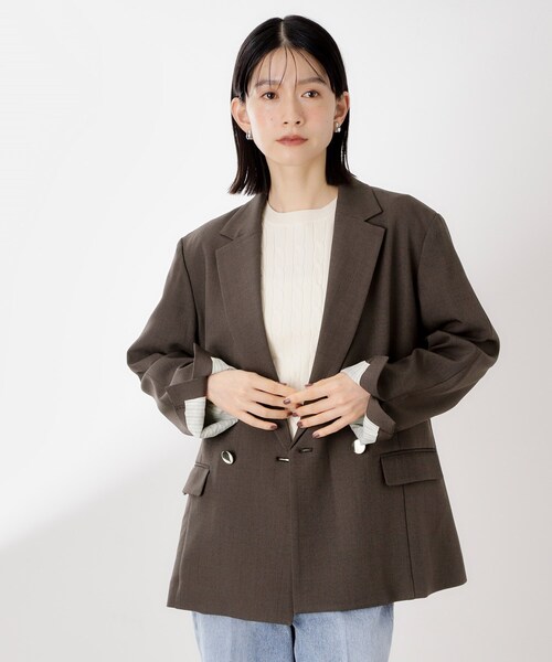 洗練されたダブルブレストジャケットが登場。 ■デザイン クラシックなダブルブレストデザインが、スタイリッシュでありながらも女性らしいシルエットを実現しています。 金ボタンがアクセントとなり、エレガントで華やかさもありながらも、カジュアルにも着こなせる一着です。 袖口を折った時に見える裏地のストライプもポイントです。 ■素材 特殊な織り方で仕上げられたシャークスキン素材は、質感と光沢感が魅力。 上品さがあり、カジュアルからフォーマルまで幅広いシーンで活躍します。 軽く、サラッとした肌触りです。 リサイクルポリエステル素材を使用し、環境に配慮したサスティナブル素材です。 ■スタイリング カジュアルなプリントTシャツやきれいめのブラウスなど、さまざまなトップスと合わせやすいです。 デニムやスラックス、スカートとも好相性です。 【仕様】 ・ポケット数:横×2 ・裏地:総裏仕立て ※照明の関係により、実際よりも色味が違って見える場合があります。また、パソコン・スマートフォンなどの環境により、若干製品と画像のカラーが異なる場合もございます。 モデル情報:身長162cm B78 W59 H84 着用サイズ:12(M) 店舗へのお問い合わせ商品番号:040-44009 ●製品寸法: 11(S):着丈64cm B97cm 袖丈58cm 肩幅42cm 12(M):着丈66cm B100cm 袖丈59cm 肩幅43cm 13(L):着丈67cm B103cm 袖丈60cm 肩幅44cm 備考:重量:約560g(サンプルサイズ)