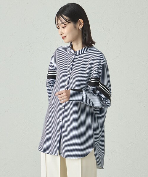 【CAST:キャストコロン 2025年秋冬アイテム】【Design】プリントしたストライプ柄の生地を使用したチュニックブラウス。肩から後ろにかけてニットリブがコンビされた、他にはないデザイントップスです。ストライプ柄でシャープな印象がありながらも、ラグランスリーブのゆったりシルエットでストレスフリーな着心地。袖部分にもニットリブが付いており、動きやすさがありつつ袖を上げた時にきちんと留まる計算された仕様。【Fabric】ポリエステル素材にストライプ柄をプリントしています。ハリがありながらも適度なしなやかさのある素材で、シワになりにくいのが特徴。ケアのしやすさも嬉しいポイント。素材には吸水速乾機能が付いています。【Styling】ストライプ柄はきちんと感も出るので、お仕事にもデイリー用途にも使えて汎用性抜群。ヒップにかぶる丈で、体型カバーも叶います。●洗濯:手洗い可透け感:なし伸縮性:あり生地の厚さ:普通おすすめ着用期間:春、秋、冬※この商品はサンプルでの撮影を行っています。実際の商品とイメージ、サイズ、品質表示、原産国等が異なる場合がございます。※店頭及び屋外での撮影画像は、光の当たり具合で色味が違って見える場合があります。商品の色味は、スタジオ撮影の画像をご参照ください。