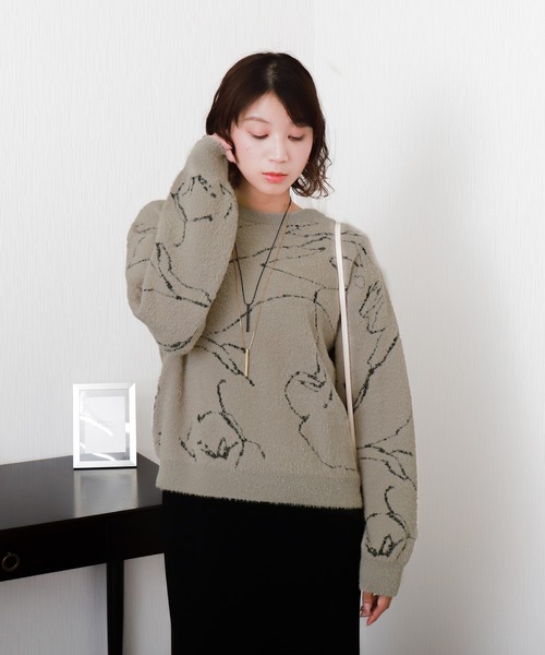 線画で描かれたニュアンス柄がモードな印象つくるニット。 落ち着いた色合いで大人な印象をプラスしてくれます。 ■point ・細いラインで描かれたニュアンス柄。 ・落ち着いたシックな配色。 ・短めシャギーでふわっと上品な印象のニット。 ・チクチクしにくい。 ・トレンドの短丈シルエット ・ゆったり身頃 ■design 全面にあしらったニュアンス柄が目を惹くニットプルオーバー。 細いラインと派手になり過ぎないシックな配色で総柄ながらも落ち着いた印象に。 ほど良い厚みで柔らかく肌触り優しいニット素材は、リラクシーな着心地。 チクチクしにくいのも嬉しいポイントです。 日常使いしやすく、着心地にもこだわった優秀アイテム。 ■fabric 肌触りがよく、柔らかいシャギーニット素材。 チクチクしにくく、ストレスフリーな着心地です。 …………………… 透け感:なし 厚さ:厚い 裏地:なし 光沢感:なし 伸縮性:あり ポケット:なし 洗濯方法:手洗い・ドライクリーニング・ウェットクリーニング …………………… ※ネットに入れてのお洗濯をお勧めいたします。 ※詳しいお手入れ方法は商品タグをご参照ください。 ■coordinate シンプルにモノトーン系でまとめるのがおすすめ。 タイトスカートやきれいめパンツと合わせると 洗練された大人なシックな装いに。 マーメードスカートなどちょっと甘さをプラスすれば カジュアルなアイテムとも相性良く、デイリーに使えるアイテムです。 ------------------------------ セーター ニット プルオーバー トップス レディース シャギー ジャガード オフィスカジュアル ショート丈 長袖 線画 ニュアンス柄 総柄 秋 冬 きれいめ カジュアル ------------------------------