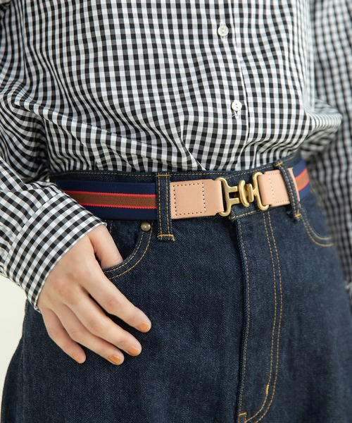 トラッドな配色のゴムに牛革レザーを組み合わせたデザインベルト。シンプルながらも真鍮のバックルがポイントとなりスタイリングにアクセントを加えてくれます。しっかり太さもあり、アジャスターも付いているのでサイズ調整も可能。パンツやスカートはもちろん、ワンピースのウエストマークとしてもオススメです。【素材の特性・お取り扱いの注意】・取り扱いの注意については取り扱い表示をよくご確認の上、着用をお願い致します。・この製品は、天然の革を使用している為、1つ1つ色や質が異なりますので、ご了承ください。ヌメ革を使用しておりますヌメ革は使い込むほどに色が濃くなり味が出てきます。雨や汗で濡れると、シミが付きやすいのでご注意ください。※撮影画像は、光の当たり具合やモニターの環境により色味が違って見える場合があります。あらかじめご了承ください。※着用の商品はサンプルで撮影しております。お届けする実際の商品と仕様、加工、サイズが若干異なる場合がございます。