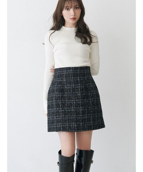 "ツイード素材をマーキュリーデュオオリジナルで糸からこだわって作りました。生地にはシルバーの糸をスラブ糸に撚って、全体が上品な輝きになるよう配色しました。 スカートの丈感は足が一番きれいに見える丈で作り、広がりすぎないタイトシルエットの台形ミニスカート。 どんなトップスとも合わせやすいスカートです。 ▼スタイリング セットアップコーデのできる、ノーカラージャケットとロングブーツを合わせたスタイリングがおすすめ。 トップスはぴたっとしたニットから、フリルブラウスでリボンを見せてたスタイリングもトラディッショナルな雰囲気を演出できます◎ ペプラムジャケットに合わせても◎ ~~ZOZOTOWNでお買い物を楽しむ便利機能~~ ♡商品のお気に入り登録 完売カラーの再入荷時、ラスト1点の時、セール開始時に通知でお知らせします。 予約アイテムが入荷して通常販売になった時もお知らせしてくれます! ♡ブランドのお気に入り登録 新商品や再入荷、セールやクーポン情報など、 ブランドのお得な情報をいち早く受け取ることができます! ※実際にお届けする商品と仕様やサイズが異なる場合がございます。 また、生産の都合上、お届け時期が前後する場合がございます。 ※着用画像はすべてサンプルです。 ※ブラックの色、青みが強いですが全体的にブラック寄りの色になります。 ※SM着丈差3cm