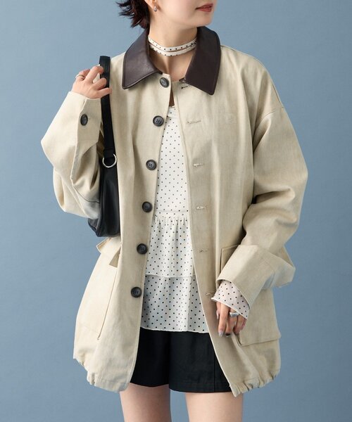 襟元が目を惹くアクセントに♡大人のカジュアルアウターが登場! ●デザイン ・トレンド感のあるオーバーサイズで、こなれた雰囲気を演出してくれるジャケット◎ ・襟部分の合成皮革が、スタイリングに上品さをプラスします。 ・カジュアルながらも、どこか落ち着いた印象を与えてくれる大人可愛いアイテムです♡ ・ウエスト部分をボタンで留めてウエストをシェイプすることも可能です! ●素材 肌触りの良いコットン素材で、快適な着心地。 ----------------------------------------------------- 洗濯:30度限度 手洗い アイロン:低温120℃まで スチームなし タンブル乾燥:不可 裏地:なし 伸縮性:なし 光沢感:なし 生地の厚さ:普通 ------------------------------------------------------ ●スタイリング ・Tシャツやカットソーに羽織って、デニムやチノパンと合わせれば定番のカジュアルスタイルが完成。足元はスニーカーやブーツと相性◎ ・インナーにブラウスやシャツを合わせて、スラックスやフレアスカートと合わせれば、きれいめカジュアルなスタイルにも♡ ・ワンピース合わせなどのフェミニンコーデも可愛く決まります! ●おすすめスタイリングアイテム ティアードミニスカート スクエトゥロングブーツ ●スタッフ着用コメント 身長157㎝ 骨格ストレート ・ゆったりとしたシルエットと大きめのサイズ感が体型カバーにもなり嬉しいポイントです◎ ・裾を絞り、スタイルの変化を楽しむこともできます◎ 身長165㎝ 骨格ウェーブ ・配色カラーの大きめの襟が目を惹きオシャレで可愛いです! ・ウエスト部分をボタンで留めてウエストを細く見せられるのも嬉しい◎様々なスタイルを楽しめます! ------------------------------------------------------ 商品のお気に入り登録➡お気に入りアイテムの値下げ・再入荷・在庫1点などの通知を受け取ることができます。ブランドのお気に入り登録➡ 新商品や再入荷、セール、クーポン配布などお得な情報を受け取ることができます。※サイト上のカラー名と、お届け商品に記載されているカラー名が異なる場合がございます。※商品の色味は、撮影場所や光のあたり具合などにより色味が違って見える場合が御座います。また、お客様のお使いのPCのモニター環境などにより色味が違って見える場合が御座います。予めご了承の上ご注文下さい。※ご注文いただいた予約商品のお届け時期の確認は、注文履歴ページより行えます。 ------------------------------------------------------
