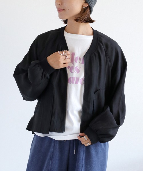 いつものコーデにちょっとしたミリタリーテイストを。 デザインとシルエットにこだわったレイヤード風のドロストブルゾン。 バックスタイルも抜かりなく、女性らしさを演出♪ ◇Point◇ ボリューム感のあるショート丈のミリタリーブルゾン。フレアシルエットで動きの出るデザインです。 ゆったりとした身幅にバランスの取りやすいショート丈、ボリュームスリーブ。シアー感のある生地を使用し、軽さと抜け感を演出。 バックは生地を2枚重ねにしてレイヤード風に。さらにドローコードを絞ることでバックシルエットにメリハリを付けられます。 ドロスト効果で背中の生地にギャザーが生まれ、女性らしい上品なドレープを表現しています。 スポーティーでカジュアルな印象になりがちなブルゾンですが、バックのギャザーのデザインや光沢のある素材感で女性らしく着ていただけます。 ◇Material◇ 再生繊維+ポリエステルの混紡素材。さらっとした生地でとても軽く、やや光沢のある生地で上品さをプラス。 やや透け感のある生地なので春から秋にかけてロングシーズンで着用いただけます。 裾はリブ仕様でスポーティーな雰囲気に。前後で着丈の長さを変えています。 ※裏地なし。 ※両サイドポケットあり。 ※家庭洗濯可能 ◇Coordinate◇ キレイめスラックスやワンピースで合わせてスポーツミックススタイルがおすすめ。 裾のドローコードを絞ってAラインシルエットを演出するのも素敵です。 ショート丈なのでインナーをタックインするとスタイルアップが期待できます。 ※照明や天候により実際の色味と異なって見える場合がございます。ご了承くださいませ。 【キーワード】 #Y2K#10代#20代#30代#40代#50代#シアー#ライトアウター#ミリタリー#クロップド