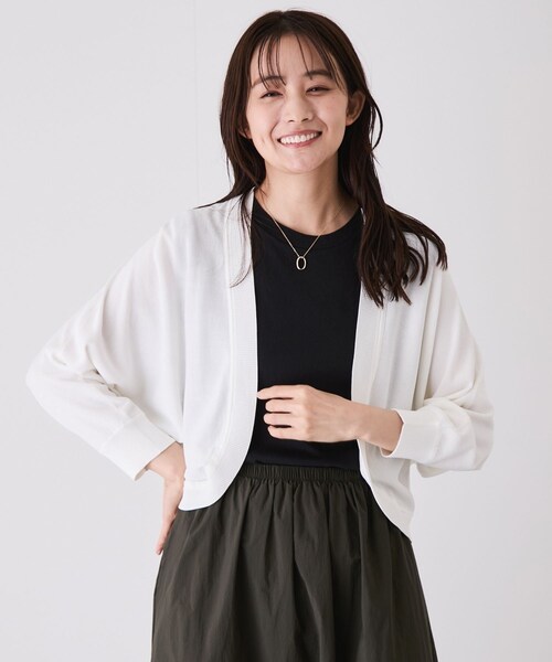 【デザイン・シルエット】 ・フロントオープンタイプでさらりと羽織れるカーディガン。 ・コンパクトなシルエットですっきりとした着こなしに。 ・前立て、裾、袖口がリブのデザインになっておりシンプルなデザインにアクセントをプラス。 ・ドルマン袖が気になる二の腕ラインをしっかりカバーしながらラフな着こなしを叶えます。 ・薄手のニット素材にUVカット機能をプラスし、日差し対策や冷房対策にぴったり。 【素材感】 ・レーヨン混の滑らかな肌当たりのニット素材 ・UVカット機能付き ・手洗い可能&毛玉のできにくい加工でご自宅でのお手入れも簡単です。 【カラー】 01 クロ 09 グレー 12 シロ 40 コン 【スタイリングポイント】 ・Tシャツやカットソー、シャツなど様々なトップスに合わせるだけでコーデが決まる、着回し力の高いアイテム。 ・シンプルなデザインだからこそ、デザイン性の高いアイテムからミニマムなコーディネートまで幅広く相性抜群です。 ・コンパクトな丈感がスタイルをすっきり見せてくれます。 ・綺麗めなワンピースに合わせて上品に決めるのもおすすめです。 ・ちょっとした食事会などフォーマルな場面にも◎ 裏地:なし 光沢感:なし 透け感:シロややあり ポケット:なし 伸縮性:あり 生地の厚さ:普通 ボタン:なし その他仕様:UVカット機能、アンチピリング加工 季節:春夏秋 ※撮影時の光、お使いのモニター環境によって色の見え方が違う場合がございます。予めご了承ください。 モデル身長:167cm 着用サイズ:M