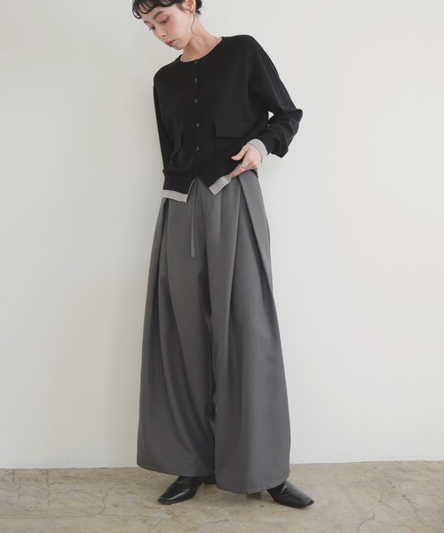 フロントのラップディテールとタックが特徴的なデザインワイドパンツ ウエストをすっきりと見せつつ、ワイドすぎないシルエットで大人の抜け感を演出! フロントに施された深めのタックとラップディテールが立体感を生み出し美しいシルエットを演出します。 ボディラインを拾わないストンと落ちるストレートシルエットはリラクシーな着心地◎ ハイウエストシルエットとウエストベルトがアクセントになり目線を上げ美脚効果のあるアイテムです。 ほんのり光沢のある上質な質感のヘザーエステルツイルを使用。 オールシーズン着用可能なさらりとした素材感で、ワードローブに1着欲しいアイテム オフィスから休日のお出かけまで、多彩なシーンで頼れる万能アイテムです。 後ろがゴム仕様で楽チンながらもシルエットはすっきりとしているのでデイリーに重宝します◎ ------------ 裏地 なし 透け感 なし 伸縮性 なし 光沢 ややあり ポケット あり 洗濯方法 手洗い可 ------------ 【スタイリング】 シアートップスやコンパクトなニットと合わせて、今っぽく着こなすのもおすすめ! 春夏はブラウスやTシャツで爽やかに、秋冬はジャケットやニットと合わせてシックに着回し可能です。 シャツブラウスとのスタイリングできれいめなオフィスファッション、スウェットやニットと合わせてカジュアルダウンしたスタイリングもおすすめです。 ウエストコンシャスなデザインなのでトップスインしたコーディネートもオススメ。 同素材でカフデザインダブルテーラードジャケットも展開しており、セットアップが可能です。 ※セットアップ対応商品は、生産時期によって色味が上下で若干異なる場合がございます。 ※お使いのモニター設定、お部屋の照明等により 実際の商品と色味が異なる場合がございます。 物撮り写真はできる限り実物の色に近づけるようにしておりますので、 色に関しては商品の物撮り写真をご参考ください。 ▼もっとお買い物を楽しんで頂く為に▼ 〈商品のお気に入り登録〉 お気に入りの登録をして頂きますと セールの通知・ラスト1点になった時の通知や、再入荷通知を受けることができます。 〈ブランドのお気に入り登録〉 新商品の発売や再入荷、タイムセールやクーポン発行のお知らせなど LIANがお届けするお得な情報を受け取ることができます。