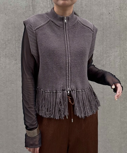 ボリュームフリンジがトレンド感を纏う、ニットベスト【Point】秋冬らしいボリュームフリンジが印象的なニットベスト。センターのWジップと高めのスタンドカラーが、季節感の中にモードな雰囲気を添えます。ショート丈ながらも広めの身幅でリラックス感を演出し、程よい抜け感のあるシルエットに。肩部分にはヨーク切替を施し、全体にメリハリをプラス。Wジップ仕様で着こなしのアレンジも楽しめます。ウール不使用でチクチク感がなく、初秋から秋冬ムードを先取りできる一枚です。【Styling】・存在感のあるトップスなので、シンプルなボトムとの合わせが好相性・女性らしく着こなすなら、タイトスカートがおすすめ・クールに仕上げたい日は、ナイロンパンツやトラックパンツなどワイドシルエットと合わせて・シンプルなワンピースの上にレイヤードするだけでも、着映えスタイルが完成----------------------------------------------------【Detail】・肩幅広め×立体シルエットで気になる二の腕をさりげなくカバー・ワントーンでまとめたデザインは、コーディネートに取り入れやすく着回し力◎・インナー次第でロングシーズン活躍透け感/なし光沢感/なし伸縮性/あり生地の厚さ/やや厚め----------------------------------------------------※撮影場所により、実際の色味と若干異なる場合がございます。またパソコン・スマートフォンなどの環境により、若干製品と画像のカラーが異なる場合もございます。予めご了承ください。※商品画像はサンプルのため、色味やサイズ等の仕様に変更がある場合がございますので、予めご了承ください。----------------------------------------------------【お買い物を楽しんで頂く為に】■商品のお気に入り登録お気に入りの登録をして頂きますと完売カラーの再入荷通知や、ラスト1点の通知を受け取ることができます。■ブランドのお気に入り登録新商品の発売や再入荷、タイムセールやクーポン発行のお知らせなど&g'aimeがお届けするお得な情報を受け取ることができます。