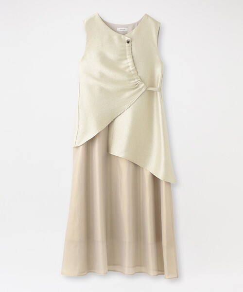 メタリックな質感が視線を引きつける、レイヤードワンピース【素材】上部には、メタルのような控えめな光沢感と凹凸感あるブッチャー素材を使用スカート部分にはシアー素材を採用し、軽やかさと抜け感をプラス。異素材のコントラストが、印象的な存在感を生み出します。ご自宅で手洗い可能なイージーケアも嬉しいポイント。【シルエット/デザイン】ベストを重ねたようなアシンメトリーなデザインに異素材のスカートをレイヤードしたデザイン。構築的な上身頃と、動きのある軽やかなスカートのバランスが、洗練されたシルエットを演出します。プルオーバータイプがリラクシーな着心地。フロントの裏側に隠れているテープをウエスト左脇のループに引っ掛けると、高めの腰位置にアクセントを付けたシルエットに変化させて着こなすことも可能です。【スタイリング/その他】一枚でスタイリングが完成されているワンピース。フラットシューズを合わせて程よく力の抜けたカジュアルなスタイルはもちろん、華奢なサンダルと繊細なジュエリーを合わせてドレッシーにも着まわせる1枚です。━━━━━━━━━━━━━━━━━━━━━━━━━━お買い物をお楽しみ頂くために<商品のお気に入り登録>完売カラーの再入荷通知など、お得な情報をお届けします。<注意事項>この商品はサンプルでの撮影を行っています。実際の商品とイメージが異なる場合がございます。撮影環境により、光の当たり具合で色味が違って見える場合があります。あらかじめご了承下さい。