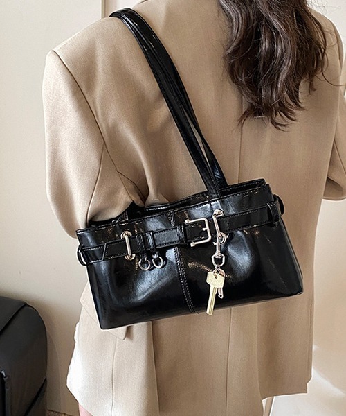 【遊び心をプラスした鍵チャーム付きエナメル調ショルダーバッグ】 エナメル調の艶やかな質感が魅力的なショルダーバッグ。 鍵チャームがアクセントとなり、シンプルながらも上品でありながら少し遊び心を感じさせるデザインに仕上げています。 クラシックな雰囲気と現代的なエレガンスを兼ね備え、どんなコーディネートにも洗練された印象をプラスします。 デイリー使いから、ちょっとしたお出かけにもぴったりなアイテムです。 詳細補足 開閉:ファスナー 内ポケット:ファスナーポケット×1 A4収納:不可 ※鍵チャームは取り外し可能です。 【c.u.l】 ▼お気に入り登録をおすすめします▼ お得なセール情報や、人気完売商品の再入荷情報 ラスト1点の通知など、耳寄りなお買い得情報をいち早く受ける事ができます。 ブランド【c.u.l】のお気に入り登録もご一緒にお願い致します。 ■取扱注意事項■ ※サイズは、測定方法と測定者によって多少の誤差がありますのでご了承下さいませ。 また体型によって、サイズ感に個人差がございます。(平置き採寸) ※商品によってはシワがつきやすく、畳みジワや折りジワなどが強く出る場合がございます。 その際は加湿した風呂場に数時間干すか、スチームアイロンでのお手入れをお勧めしております。 ※生地の素材上、においが気になる場合がございます。 その際は陰干しして頂くと、ほとんど感じにくくなります。 ※レース等の繊細な素材を使用している場合には、お取り扱いにご注意下さい ※デニムを使用した製品は、インディゴ染めをしています。汗や摩擦により移染しやすいので、白色、淡色の組み合わせや重ね着はお避け下さい。 ※ニット素材を使用した製品は、重みで伸びやすくなりますのでハンガーでの保管はお控えください。 ※お洗濯の際には、品質表示の指示に従ってください。必要であれば専門店にご相談ください。 家庭でご洗濯できる商品に関しては、洗濯専用ネットをご使用の上、個別での洗濯をお勧めいたします。 お色物は、色移りする可能性がございます。 ※着用画像は撮影状況や光によって、多少異なる場合がございますので、置き画像をご確認下さい。 ※2023年7月1日より、環境に配慮した取り組みの一環として、紙のアテンションタグを廃止しております。
