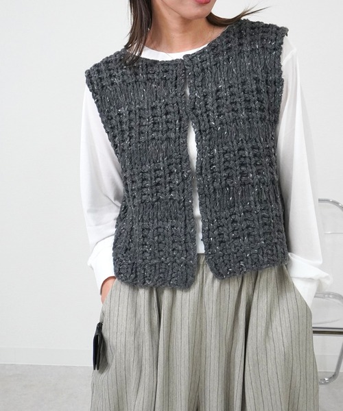■デザイン ざっくりとしたローゲージ編みが魅力のニットベスト。 糸に程よいムラ感があり、ナチュラルで温かみのある表情を引き立てています。 フロントはシンプルなオープンデザインで、リラックス感と抜け感を兼ね備えた仕上がりに。 ハンドメイドのような風合いが秋冬のコーディネートに季節感をプラスしてくれる一枚です。 ■スタイリング シャツやシアートップスの上に羽織ることで、立体感のあるレイヤードスタイルが完成。 デニムを合わせればカジュアルに、スラックスやロングスカートを合わせれば洗練されたナチュラルモードに仕上がります。 アイボリーを基調としたカラーはベージュやブラウンなど今季のおすすめカラーとも相性が良く、 同系色でまとめたトーンオントーンスタイリングもおすすめ。ブーツやレザー小物を合わせると秋冬らしい深みのあるコーディネートに。 ※照明の関係により、実際よりも色味が異なって見える場合があります。またパソコン・スマートフォンなどの使用端末の環境により、若干製品と画像のカラーが異なる場合もございます。 ※商品の色味は、商品アップ画像をご参照ください。 gossara(ゴサラ) ″今欲しい″ ″今着たい″ をコンセプトに可愛いと思うものセレクトし、 simpleでnaturalな可愛いitemが並びます◎ 大人カジュアルをメインに流行を取り入れ、レイヤードや色使いでワンランクupした、 トータルコーディネートをご提案◎ 【気になる商品はお気に入り登録をおすすめ】 ■商品のお気に入り登録 再入荷通知、セールなどの通知を受け取ることができます。 ■ブランドのお気に入り登録 新商品や再入荷など、ブランドのお得情報をいち早く受け取ることができます。