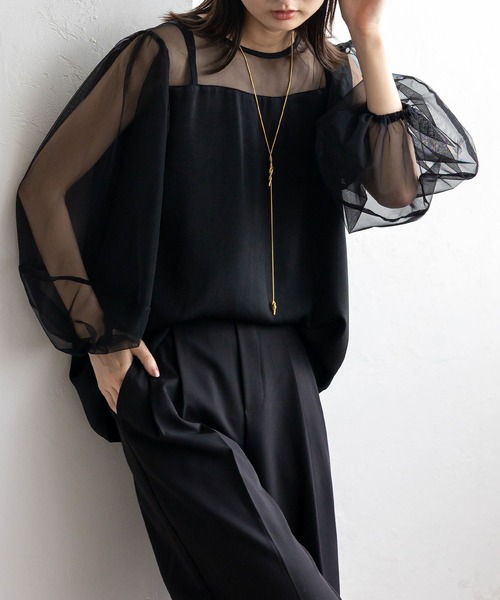 【デザイン】 チュールドッキングレイヤード風トップス 繊細なチュールと、なめらかで肌触りの良いサテン素材を組み合わせた、 レイヤード風デザインのトップス。 キャミソールを重ね着しているようなフェイクレイヤード仕様で、1枚で洗練されたこなれ感を演出します。 袖口にはゴムを施し、ふんわりと広がるボリュームスリーブが女性らしい柔らかさと可憐な印象をプラス。 上品さと抜け感を兼ね備えた、大人フェミニンな一着です。 【サイズ等】 サイズ:FREE 総丈:66.5cm 身幅:58cm 肩幅:38cm 袖丈:53.5cm 袖口幅:10cm 重量:140g 素材:ポリエステル100% …………………… 伸縮性:なし 裏地:なし 透け感:【チュール部分】あり/【サテン部分】white若干あり 生地の厚さ:薄い ポケット:なし …………………… 【お取り扱い上の御注意】 繊維および染料の性質上、汗や水で濡れますと色落ちすることがあります。 長時間の水などの浸漬や浸け置き洗いは、縮みや色落ちの原因となりますのでお避けください。 洗濯の際は他の物と分けて洗ってください。 洗濯後は直ちに軽く脱水し形を整えすばやく干してください。 家庭洗濯時のタンブル乾燥はお避けください。 濡れた状態で他の物との擦れによる色移りにご注意ください。 デリケートな素材を使用していますので摩擦や突起物に気を付けて、引っ掻き傷や穴を作らない様ご注意下さい。 洗濯ネットをご使用下さい。 あて布をしてアイロンを掛けてください。 [カラー] ブラック・ホワイト 着用モデル身長:172cm/着用サイズ:FREE ◆商品のお気に入り登録◆ 完売カラーの再入荷通知や、ラスト1点の通知、 セールの通知も受け取ることができますので、是非ご登録ください。 ◆ブランドのお気に入り登録◆ 新商品や再入荷などの情報を受け取ることができますので、是非ご登録ください。