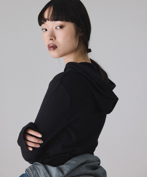 《イージーケア》肌離れのする着心地と、レイヤードしやすいコンパクトさが魅力。程よい透け感が女っぽい、1枚で様になるフードプルオーバー◆2025-26秋冬◆ ADAM ET ROPE' FEMME 【Material】 イタリアの老舗メーカーAlbini社の紡績部門「I COTONI DI ALBINI」(イ コットーニ ディ アルビニ)の開発素材を使用。 50/1の強撚糸をガス焼きすることで、毛羽感が解消され、清涼感のあるドライタッチな肌ざわりが特徴の素材。 それらをガーゼ調に編むことで、軽さと柔らかな風合いが実現し、加えて伸縮性もあり着心地も快適に。 【Design】 程よく体にフィットしたフード付きのロングスリーブトップス。 フードは一枚仕立てで軽く仕上げ、重くない印象に。 袖丈はやや長めに設定することで、適度に余る袖口がポイント。 【Color】 モードなブラック、柔らかい印象のホワイトの2色展開。 【Styling Point】 スラックスやデニムにはもちろん、ミディ丈スカートとの相性も◎ 秋見え素材のコーデュロイやスエード、毛羽感のあるウール系など素材感のあるボトムとの合わせもおすすめ。 --------------- 透け感:ややあり 裏地:なし 伸縮性:あり 光沢感:なし 生地の厚さ:薄手 開き方:かぶり ポケット:なし --------------- ◇モデル情報 身長:169cm size:F