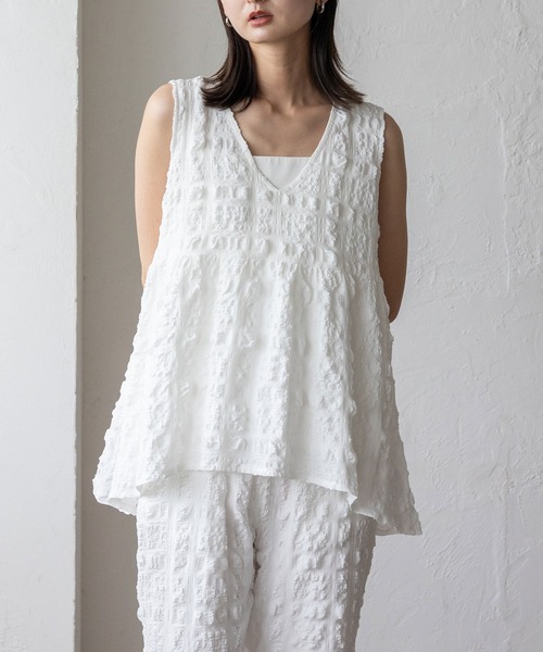 【デザイン】 Vネックノースリーブペプラムトップス 着るだけでこなれ感。毎日頼れる大人のペプラムトップス ポコポコした凸凹感のある表情豊かな素材がポイント。 シワになりにくくて、おうち時間からお出かけまで頼れる1枚です。 ふんわり広がるAラインシルエットが、気になるお腹まわりをさりげなくカバー。 裏地付きで透けにくく、インナーを気にせず着られるのも嬉しいポイント◎ Vネックで顔まわりはすっきり。 大人の抜け感をプラスしてくれるから、デニムやスラックスと合わせて、さっと着るだけでサマになります♪ ラクなのにちゃんと見えするノースリトップスです。 同素材のパンツを組み合わせれば、簡単に上品なオフィスカジュアルコーデが完成。 立体感のある凹凸素材が、シンプルなデザインに程よい表情を加え、こなれた印象に仕上げます。 Vネックノースリーブペプラムトップス × ストレートイージーパンツ → ウエストまわりをふんわりカバーしつつ、すっきり縦ラインで美シルエット。ジャケットを羽織れば、きちんと感も◎ 単品使いもできるから、着回し力も抜群。セットで揃えておけば、シーンに応じて幅広く活躍してくれます。 【サイズ等】 サイズ:FREE 総丈:前64cm/後73cm 肩幅:35cm 身幅:46cm 袖口幅:20cm 重量:220g 素材:表地 ポリエステル97% ポリウレタン3% 裏地 ポリエステル100% …………………… 伸縮性:あり 裏地:あり 透け感:オフホワイト若干あり/ブラックなし 生地の厚さ:普通 ポケット:なし …………………… 【お取り扱い上の御注意】 ・繊維および染料の性質上、汗や水で濡れますと色落ちすることがあります。 ・水を含むと縮みやすい為、長時間水の浸漬や浸置はさけ、選択後は直ちに整形し干してください。 ・漂白剤や蛍光剤の入った洗剤は使用しないでください。 ・家庭洗濯時タンブル乾燥はお避け下さい。 [カラー] ブラック・オフホワイト 着用モデル身長:164cm/着用サイズ:FREE ◆商品のお気に入り登録◆ 完売カラーの再入荷通知や、ラスト1点の通知、 セールの通知も受け取ることができますので、是非ご登録ください。 ◆ブランドのお気に入り登録◆ 新商品や再入荷などの情報を受け取ることができますので、是非ご登録ください。
