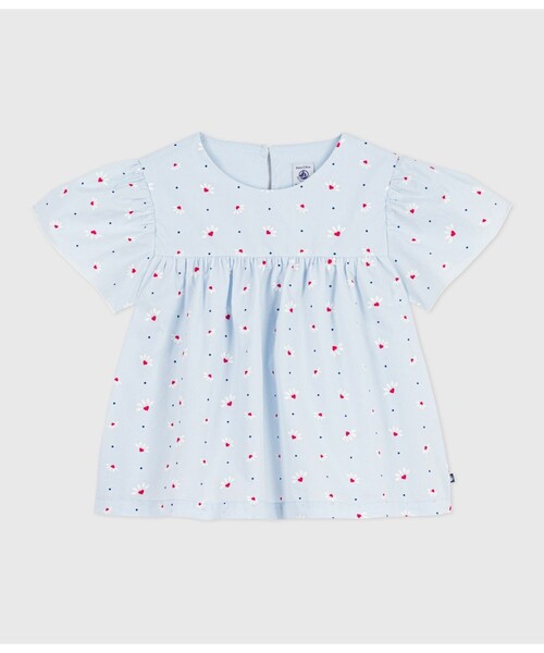 ハートのフラワー柄がとってもキュートな半袖ブラウスです。環境にやさしく、柔らかな着用感のポプリン素材を使用しています。胸元の切り替えとギャザーがデザインのポイント。デイリーからおしゃれをしてのお出かけまで、幅広く対応する注目のアイテムです。※プリントは永久的なものではなく、もみや摩擦でひび割れたり、繰り返しの洗濯によるプリントの変色や、脱落が生じる場合があります。中性洗剤などで単独洗いをしてください。