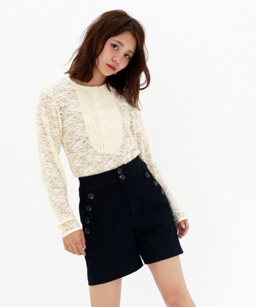黒と濃紺のノンウォッシュのデニムを使用し、きれいめに仕上げたショートパンツです。ぴったりしすぎず長めの股下が大人っぽく、マリンパンツ風の釦デザインがポイントになっています。ウエストインでもアウトでも、トップスを選ばず着まわしの効くアイテムです。