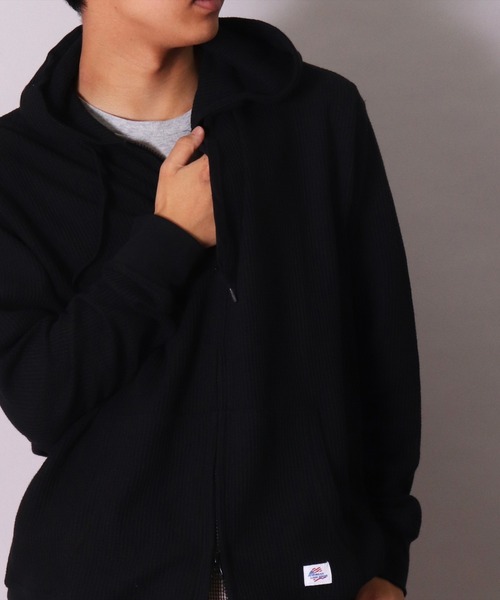 【ワッフル/サーマル】 生地面にお菓子のワッフルのようなマス目上の凹凸がある織り物です。 ワッフルは糸を浮かせて作られているため、【柔軟性があり】包み込むような柔らかい肌触りを持っています。 【伸縮性があり】着やすくて比較的扱いやすいのが素材です。 ワッフルは糸と糸との間に空間がある構造なので【吸水性・吸湿性が高い】のが特徴です。 生地の凹凸は、生地と体の間に空気の層を作り出すので【適度な保温性】があります。 生地に凹凸があるので、他の織り物と比べて【毛羽立ちが目立ちにくい】というメリットも持っています。 【商品情報】 ●サイズ感 ⇒ レギュラーシルエット/レギュラーサイズ/レギュラーフィット ●ストレッチ性 ⇒ 有り/ワッフル(サーマル)特有の ●透け感 ⇒ 無し ●生地の厚み ⇒ 薄手~中肉地 ●裏地 ⇒ 無し ●素材 ⇒ カットソー/ワッフル編み/サーマル編み ●袖丈 ⇒ 長袖/ロングスリーブ/セットインスリーブ ●ネックライン ⇒ パーカーフード付き ●ワッペン ⇒ 左カンガルーポケット部分にブランドロゴ ●プリント ⇒ 無し ●仕様 ⇒ 袖口と裾口はリブ付き/フード紐有り ●ポケット ⇒ カンガルーポケット付き 【JEMORGAN/ジェーイーモーガン】 サーマル(ワッフル)と言えばJEMORGANと言われるほど、世界的に周知されています。 保温性・伸縮性・肌触りの良さなどは最高品質のサーマルウェアブランド。 インナー製品が中心でアメリカンカジュアルファッションとして90年代より一般的に着られています。 【商品のお気に入り登録】 ♡をクリックして下さい。 完売カラーの『再入荷』、ラスト1点になった時の『通知』、セールの『通知』を受け取ることが出来ます。 【ショップ・ブランドのお気に入り登録】 新商品や再入荷のお知らせなどの『新着情報』を受け取ることが出来ます。 【ご注意下さい】 ①キャンペーン等により、販売中に価格が変動することがございます。 ②セールは予告なく終了させて頂く場合がございます。 ③商品画像はモニター環境や日光・フラッシュ・商品の色によって実物の商品と色味の印象に違いがある場合がございます。 ご了承下さい。