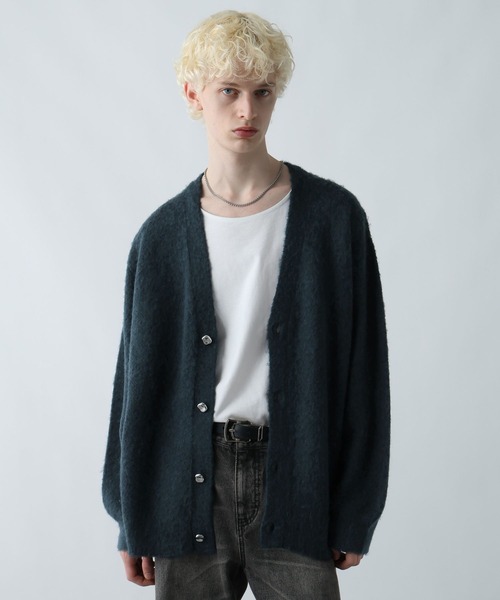 ーーー 凹凸感のあるシルバーボタンがアクセントに 肌当たりの良い上品なモヘアを使用したニットカーディガン ーーー DESIGN 凹凸感のあるシルバーボタンが上品な印象でさりげないアクセントに。 表面感のあるモヘア素材で、ふんわりとした綺麗な見え方にこだわった生地が洗練された雰囲気を演出。 無駄な装飾を省いたデザインで、汎用性の高い一枚。 ゆったりとしたサイズ感で、落ち感があるためリラックス感のある印象。 MATERIAL アクリルとナイロン、羊毛とモヘアを混紡した生地。ふんわりと柔らかく軽さもあり、ボリュームのある風合いが特徴のアクリルと丈夫なナイロンを掛け合わせた着心地と機能性に優れた生地。 肌当たりもいいチクチクしにくいモヘアと温かさのある羊毛を少量混紡する事で、ストレスフリーに暖かく着用できます。