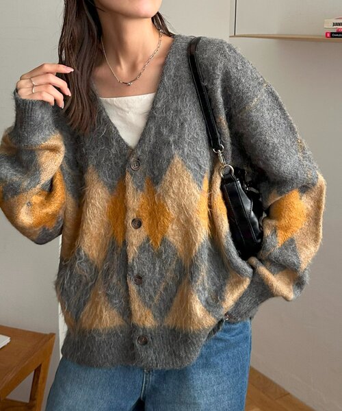 ふんわりシャギーとアーガイル柄で、レトロかわいく ●デザイン 大きめのアーガイル柄が目を惹くニットカーディガン。毛足のあるニットが、レトロ感のある柄をやさしい雰囲気に仕上げています。深めのVネックとやや短めの丈感で、羽織るだけでバランス良く決まるのも魅力◎ボタンを留めてトップス風に着ても、開けてラフに羽織ってもサマになります♪ ●素材 ふんわり柔らかな風合いのニット素材を使用。 *********************** 洗濯方法:手洗い 裏地:なし 透け感:なし 伸縮性:あり 光沢感:なし 生地の厚さ:普通 *********************** ●スタイリング デニムと合わせてカジュアルに、スカートやワンピースと合わせてフェミニンにと幅広く活躍。 ロンTやシャツをレイヤードして、こなれ感を出すのもおすすめです◎ 【お取り扱いの注意】 ※着用時、洗濯時は必ず取り扱い表示・タグをご確認の上、お取り扱いください。 ・手洗い:40℃まで(押し洗いしてください。つけ置き洗いはお避けください。) ・形を整えて干してください。 ・漂白:不可 ・タンブル乾燥:不可 ・アイロン:不可 ・クリーニング:可能(クリーニングの際は、ネットを使用してください。) ・この製品は、素材・編地の特性上、1着、1着、サイズのばらつき、風合い、色合い等が微妙に違います。あらかじめご了承下さい。 ・ご着用時の激しい運動、摩擦や引っかかりやすいアクセサリーのご使用はお避け下さい。 ・ご着用時には、爪、指輪、時計、ヘアピンなどで引っかけないようにして下さい。 ・保管の際には、ハンガーなどにかけ吊して置くと型くずれしやすいので、必ずたたんで平らな場所で保管して下さい。 ・生地の特性上、摩擦による毛羽立ちが起こることがあります。ご着用時のお取り扱いにご注意ください。 【カラー表記について】 システム上の都合により、一部カラー名がサイト表記と異なる場合がございます。 【入荷時期について】 入荷日ごとに販売数量が決まっているため、オンラインでは完売後に次期納期の数量にて 予約販売を行っております。 店舗入荷時期と予約商品のお届け時期が異なる場合がございますので、予めご了承ください。 ※追加入荷のある商品もございますので、詳しい店舗入荷時期に関しましてはお近くの店 舗へお問い合わせください。 ※店舗の在庫状況に関しましては、こちらのページに記載されている「店舗在庫」から確 認にしていただけます。 「在庫あり」の表記でも、お取り置き分などでお客様に販売できない場合がございます。 ※予約商品でも、店舗では追加がない場合もございます。ご了承ください。