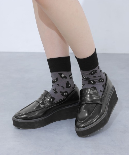 レオパード(ヒョウ)柄のソックス。◆ポイント・柄の中にデイジーやM、QをMIX・隠れハートも・スッキリと見せる無地切り替え◆コーディネートカラーコーデはもちろん、オールブラックコーデのアクセントに。