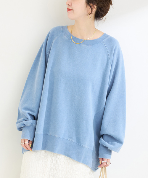 女性らしい雰囲気になるルーズな裏毛スウェット。首元の開き具合を広めに設定し、着るだけで抜け感が出るシルエットにしています。ブラックとサックスブルーはパウダー加工により程よくヴィンテージ感を出しています。着丈は気になるヒップラインを隠せるチュニック丈で、細身パンツやマーメイドスカートなど落ち感のあるボトムスとの相性が良く着ていただけます。洗濯機洗い(弱)可能で気軽にお手入れできるのも嬉しいポイントです。**********************透け感:なし裏地:なし伸縮性:ややあり光沢感:なし生地の厚さ:普通**********************【スタッフ着用コメント】《スタッフ staff.K》身長:162cm/普段サイズ:S-M/着用サイズ:フリーサイズ感:首元はやや開き、全体的にゆったりめのルーズなシルエット。素材感:裏毛のスウェット素材。スミクロとサックスブルーのみ加工により、ドライタッチな質感。着心地:ゆったりサイズなので先々レイヤードもしやすい、体のラインを拾わずラフな雰囲気のスウェットです。※あくまで個人の感想です。**********************※取り扱いについては、商品についている品質表示でご確認ください。・濃色品は色落ちすることがありますので、単独で洗ってください。・形を整えて干してください。洗濯により収縮やねじれ。型崩れすることがあります。・着用中の摩擦や、汗、水濡れにご注意ください。濡れたままの状態で擦れると、色移りすることがあります。※ブラック A(002)、サックスブルー(048)カラーについて・この製品は、加工により独特の素材感を持たせています。※こちらの商品は、B.C STOCKでの取り扱いになります。 直接店舗へお問い合わせの際はB.C STOCK店舗へお願い致します。※照明の関係により、実際よりも色味が違って見える場合があります。またパソコン・スマートフォンなどの環境により、若干製品と画像のカラーが異なる場合もございます。※商品の色味は、商品アップ画像をご参照ください。 ブラック A着用スタッフ:157cm 着用サイズ:フリーグレーA、サックスブルー着用スタッフ:163cm 着用サイズ:フリー詳細着用モデル:163cm 着用サイズ:フリー本体:洗濯機洗い(弱)
