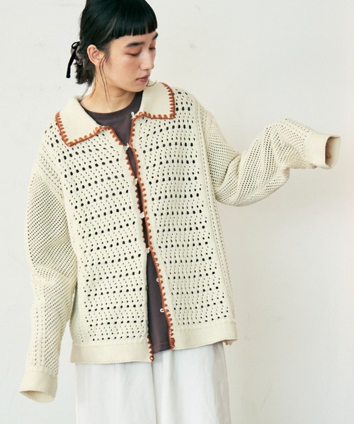【透かし模様を組み合わせた編地が存在感のあるポロカーディガン】・オーバーシルエットでメンズの古着感をイメージしたサイズ感・程よい透かし編みと配色のステッチのバランスがポイント・袖口や裾のリブの編み方にもこだわったヴィンテージ感のある1枚~スタイリング~ギャザースカートとナチュラルながらもレディライクなスタイルはもちろん、オーバーサイズのデニムやミリタリーパンツとカジュアルに着るのも◎ボリューム感のあるボトムスとラフに着るのがこなれ感がありおすすめです。- - - - - - - - - - - - - - - - - - - - - - - - - - - - - - - - -透け感:ややあり伸縮性:あり光沢感:なし洗濯: ドライクリーニング推奨- - - - - - - - - - - - - - - - - - - - - - - - - - - - - - - - -※着用、お取り扱いの際は、商品についている品質表示とアテンションタグを必ずご確認下さい。秋服/冬服/ビッグシルエット