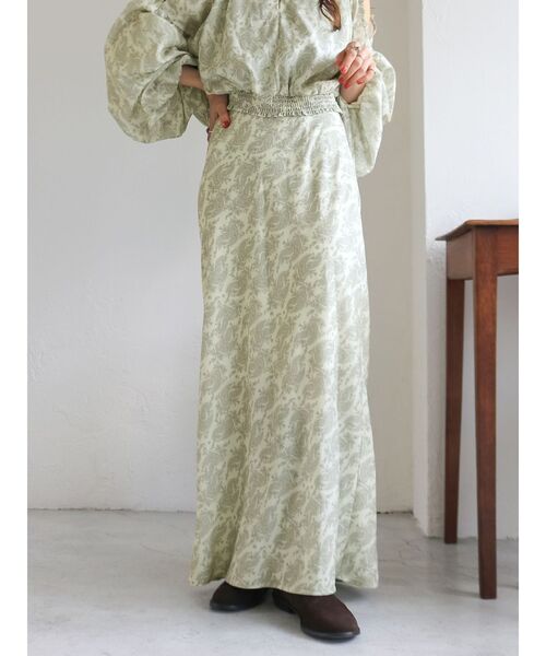ペイズリー柄をベースにしたスカート ■デザイン フィットフレアのシルエットがきれいで裾に向かってやや広がるボリュームは女性らしいシルエット。 淡いトーンでまとめられたペイズリー柄がこのシーズンのスタイリングにアクセントになってくれる1枚です。 ■生地感 軽さのあるジョーゼット生地で動きのある素材感。 透け感は気にならず着用頂けます。 ■サイズ感 腰回りはきれいにフィットするサイジング。 身頃はバイアス取りにしているので履き心地も良く足さばきも良く履いて頂けます。 ■スタイリング セットアップでエスニックなムードで着て頂くのがオススメ。 今季っぽいムードでぐっとトレンド感ある印象に。 少し寒い時期にはボリューム感のあるニットとの合わせもマッチします。 ・・・・・・・・・・・・・・・・・・・・・・ 透け感:なし 裏地:あり 伸縮性:なし 光沢感:なし 生地の厚さ:普通 ・・・・・・・・・・・・・・・・・・・・・・ ※商品画像はサンプルのため、色味やサイズ、素材の混率等の仕様に 変更がある場合がございます。予めご了承ください。 ※生地寄り画像を正規の商品の色味に近づけております。 ■商品のお気に入り登録 再入荷通知やラスト1点、お得なプライスダウンの情報も受け取ることができます。 ぜひご登録ください◎