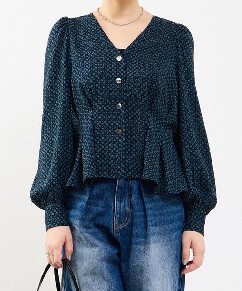 程良い開き感のVネックと袖のギャザーが女性らしさを演出してくれるブラウス。 ウエストのタックが細見え効果を演出してくれるのも嬉しいポイント。 レトロ感のある幾何学プリントで1枚で様になる万能ブラウス。 デニムとの相性抜群です。 ■fabric 細番手を二重組織にしており、薄いのに透けにくく適度なハリ感があります。 強撚糸によるシャリ感と冷感が特徴の素材です。