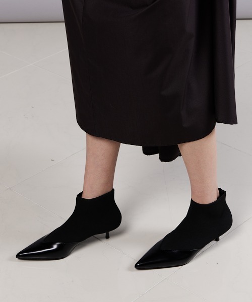 オールブラックがスタイリッシュな雰囲気のショートブーツ。シャープなつま先が足元をスマートに演出し、アッパーには足あたりのやさしいニット素材を採用することで、スタイリッシュさと快適さを両立しました。モードやシックなコーディネートとの相性も抜群。スタイリングにほどよいエッジを添えてくれる一足です。※商品画像はサンプルのため、デザイン、素材(混率等)、色味やサイズ等の仕様に変更がある場合がございますので、予めご了承ください。【お買い物を楽しみいただくためには】◆商品お気に入り登録完売カラーの再入荷通知や、ラスト1点通知、セールの通知など受け取ることができます。◆ブランドお気に入り登録新商品や再入荷など、いち早くブランドのお得な情報を受け取ることができます。