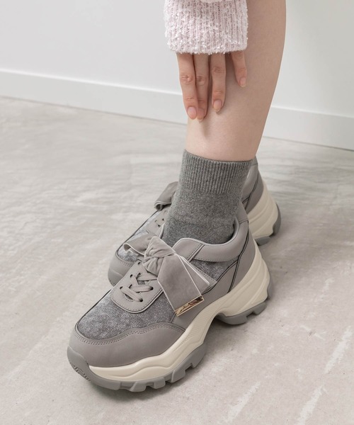 ◆2025AW新商品◆ 履くだけで足元のコーディネートが完成するソックスドッキングリボンスニーカー。 カジュアルさを程よく抑えて上品な印象を演出してくれるので、スニーカーが苦手な方にもオススメです。 POINT ・上品なベロアリボンがアクセント ・ベロアリボンは取り外し可能 ・一足で足元のコーディネートが完成するデザイン ・脚を細く華奢にみせてくれる7.5cmソール ・履き口は面ファスナーで脱ぎ履きしやすい仕様 機能性 ・全体サポートクッション 足裏への負担を軽減させるクッション スタッフの着用コメント ----------------------------- スタッフA [普段のサイズ:Sサイズ/22.5cm] 足長:22.5cm / 足幅:普通(E) / 甲高:高め サイズ選びのポイント:ゆったりめを選びます 【試着サイズ】Sサイズ/靴下で着用 【サイズ感】Sサイズでぴったりでした。 【着用コメント】つま先が少し上がっているので歩行が快適です。 ----------------------------- スタッフD [普段のサイズ:Mサイズ/23.5cm] 足長:23.5cm / 足幅:普通(E) / 甲高:低め サイズ選びのポイント:ぴったりめを選びます。 【試着サイズ】Mサイズ/靴下で着用 【サイズ感】Mサイズを履きます。 【着用コメント】クッション性があり歩きやすいです。 ----------------------------- スタッフM [普段のサイズ:Lサイズ/24.0cm] 足長:24cm / 足幅:狭め(C) / 甲高:高め サイズ選びのポイント:ゆったりめを選びます 【試着サイズ】Lサイズ/靴下で着用 【サイズ感】Lサイズを履きます。 【着用コメント】面ファスナーで調整できるのでホールド感があります。 ----------------------------- スタッフI [普段のサイズ:LLサイズ/25cm] 足長:25cm / 足幅:狭め(C) / 甲高:高め サイズ選びのポイント:甲が高いのでゆったりめを選びます 【試着サイズ】LLサイズ/靴下で着用 【サイズ感】LLサイズを履きます。 【着用コメント】ソールの高低差が少なく疲れにくそうです。 -----------------------------