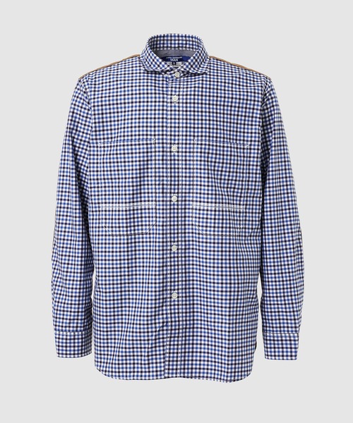 スクエアな襟のデザインが特徴的なシャツはワークシャツもモチーフとしたデザイン。胸元付けられた縦長の2つのポケットや首元のチンストタイプのボタンホールのデザインやエルボーパッチなどワークシャツならではのディテールを盛込みながらもトラディショナルなチェックのファブリックを使用して仕立てられています。また背中部分にはアウトドアテイストなバッファローチェックの生地で切替え。フロントのブルーギンガムチェックとバックの赤×黒のバッファローチェックによるコントラストが目を引く、ワーク×トラッド×アウトドアの3つの要素がMIXされたジュンヤマンならではの一枚です。 The shirt features a distinctive square collar design, and is also inspired by work shirts. It is made using traditional checked fabric, while incorporating details unique to work shirts, such as two vertical pockets on the chest, a chin strap buttonhole design around the neck, and elbow patches. The back is switched to buffalo checked fabric with an outdoor feel. The contrast between the blue gingham check on the front and the red and black buffalo check on the back is eye-catching, making this a Junyaman item that mixes the three elements of work, tradition, and outdoors.