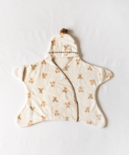 しっとりふわふわのフリース素材に、テディベア、恐竜、わんこの柄をプリントしたベビーおくるみです。 すぽっと着せるだけでかんたんに防寒できるので、寒い日のお出かけにおすすめ。 足が分かれているので、着せたままベビーカーや抱っこ紐に乗せられて便利です。 くるくる丸めてフードの中に入れ込めばコンパクトに収納できます。 お出かけのお供にはもちろん、軽くてやわらかい素材なので、 お昼寝など室内でのリラックスタイムにもぴったりです。