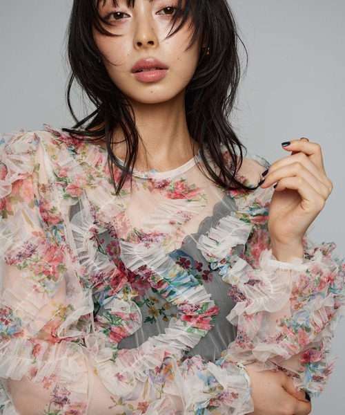 【Narcissus】フラワーフリルブラウス 【ポイント】 フラワーモチーフをあしらった繊細なチュール素材に、全体を包み込むように施されたフリルが魅力的なトップス。 【デザイン・シルエット】 フェミニンな甘さを残しつつも、軽やかな透け感が大人っぽい仕上がりに。ゆとりのあるシルエットで腰回りや腕周りを程よくカバーしてくれ、ラウンドネックは顔周りをすっきりと引き立て、上品な抜け感を演出してくれます。また、バックスタイルにパールボタンを施し、さりげないアクセントに。実用性とデザイン性を兼ね備え、着脱もスムーズに叶えてくれるのが魅力です。 【おすすめのスタイリング】 シンプルにデニムと合わせてカジュアルに、ミニボトムスやスカートと合わせてフェミニンと幅広くお使いいただけます。肌寒くなればタートルネックをレイヤードしたり、主役級の存在感を放ちながらも、幅広いスタイルに馴染むアイテムです。 【素材】 柔らかく軽やかな質感。しわになりにくく、型崩れしにくい素材なので綺麗なシルエットをキープしてくれます。 実際の商品と多少色味が異なって見える場合がございます、ご理解の程を宜しくお願い致します。 ▼商品のお気に入り登録をおススメ致します☆サイズやカラー横のハートマークをクリック! 完売カラーの再入荷や、ラスト1点の通知、セールの際の通知を受ける事ができます。 お気に入り登録も宜しくお願い致します♪