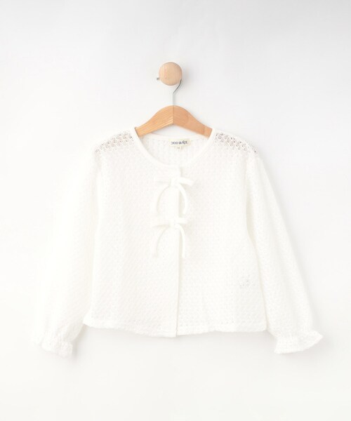 【デザイン】 レーシーな透け感のあるカーディガンです。 フロントをリボンで結んだように見えるデザインですが、着脱はボタン仕様なのでリボンの形が崩れにくく、キッズのお出かけコーデにもおすすめ! ほどよくレーシーな透け感はまだ気温の高い時期から活躍してくれそう。 【素材】 レースのような編地のニットソー素材を使用しています。 ※照明の関係により、実際よりも色味が違って見える場合があります。また、パソコン・スマートフォンなどの環境により、若干製品と画像のカラーが異なる場合もございます。 店舗へのお問い合わせ商品番号:122-34300 ●製品寸法: 10(100cm):着丈30cm B68cm 袖丈31cm 肩幅30cm 11(110cm):着丈34cm B72cm 袖丈35cm 肩幅32cm 12(120cm):着丈37cm B76cm 袖丈38cm 肩幅34cm 13(130cm):着丈40cm B80cm 袖丈41cm 肩幅36cm 14(140cm):着丈43cm B84cm 袖丈44cm 肩幅38cm 15(150cm):着丈46cm B88cm 袖丈47cm 肩幅40cm 備考: