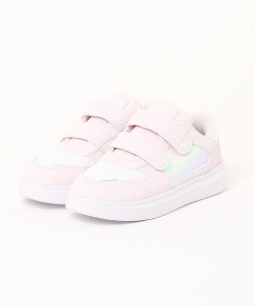 キッズシューズサイド、履き口のオーロラ素材がきらっと輝くベルトスニーカーです。通園、通学にも使いやすいシンプルデザイン。2本のベルトで着脱しやすい設計です。かかとをホールドするカップインソールは取り外し可能です。履き口のクッションやシュータン裏のメッシュ素材で足首回りをやさしくサポートします。軽量アウトソールで長時間履いても疲れにくい素材です。