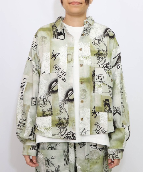 + ScoLar 商品 + シルクハットをかぶったネコちゃんに、バラや惑星など黒を基調とした線書きイラスト、 そこに重なるように繊細なレース柄が加わったアンティークな雰囲気のヴィンテージ風シャツ。 ゆったりとしたサイズ感に後ろはやや長めの丈感になっていて、さりげなく体型カバーもしつつオシャレ見え。 フラップ有り・なしで左右でデザインの異なる胸ポケットもオシャレなアクセントに!! 見た目だけでなく実用性にもしっかりとこだわったデザインとなっております。 透けにくいしっかりとしたツイル生地を使用しており一枚でも着用可能◎ 涼しくなってきたらTシャツなどに重ねて羽織りとしても活躍してくれます♪ 同柄の【153613:バイオ加工レースプリントパンツ】と合わせたセットアップ風コーデもオススメです! ■同柄・スタイリングitemはコチラ⇒【153613】 ●model:Ashley 163cm/64inch ●model着用:53(ベージュ) (着用商品はサンプルの為、実際のデザインと変更がある場合がございます) ーーーーー 裏地:なし 透け感:やや透け感あり 生地の厚さ:普通 生地感:ややしっかりめ 伸縮性:なし ポケット:あり ーーーーー ※ スリットあり 取り扱いのご注意: ※この製品は摩擦や水濡れにより色落ちにすることがありますのでご注意ください。 ※この製品は生地独特な風合いを出すために、製品加工してあります。(製品は1点、1点多少表情が違います) ※この商品は糸及び編組織の性質上、引っ掛け・引っ掛かりやすい為、着脱時や取り扱いにご注意下さい。