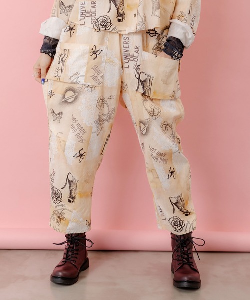 + ScoLar 商品 +同柄の【153612:バイオ加工レースプリントシャツ】とセットで着られる、シックな線書きプリントがアンティーク感のあるヴィンテージ風コットンツイルパンツ。カラーは36(カーキ)と53(ベージュ)の2色展開で大人っぽく着用していただけます。ほどよくルーズなシルエットとかすれたプリントデザインがコーデにこなれた雰囲気をプラス。二重に重なったサイドポケットに、さらに背面にもポケットが付いており合計5つのポケット付き!深めポケットでスマホもすっぽり収まるので手ぶらでお出かけも出来ちゃいます♪■同柄・スタイリングitemはコチラ⇒【153612】●model:Ashley 163cm/64inch●model着用:53(ベージュ)(着用商品はサンプルの為、実際のデザインと変更がある場合がございます)ーーーーー裏地:なし透け感:やや透け感あり生地の厚さ:普通生地感:普通伸縮性:なしポケット:ありーーーーー※ウエスト調節可能取り扱いのご注意:※この製品は摩擦や水濡れにより色落ちにすることがありますのでご注意ください。※この製品は生地独特な風合いを出すために、製品加工してあります。(製品は1点、1点多少表情が違います)※この商品は糸及び編組織の性質上、引っ掛け・引っ掛かりやすい為、着脱時や取り扱いにご注意下さい。