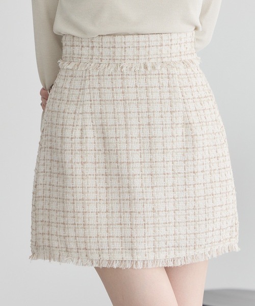 ウエストと裾のフリンジデザインが目を惹くクラシカルなツイードスカート。膨らみや凹凸を活かしたツイード素材が華やかにシーズンムードを高めます。裏地付きで肌当たり良く、ウエスト後ろゴムでリラクシーな穿き心地なのも嬉しいポイント。シンプルな台形ミニスカートはジャケットなどアウターとバランスよくスタイリングできるおすすめのアイテムです。透け感[なし]生地の厚さ[普通]光沢感[なし]伸縮性[なし]裏地[あり]ポケット[なし]※モデル着用画像は光の当たり具合で色味が違って見える場合がございます。商品の色味は物撮りの画像をご参照ください。● earth music&ecology ●(アースミュージック&エコロジー)「いいことある服。」たかが服。されど服。波風の多い日々のなかでもほほえんで前を向くあなたを、つつんで一緒に歩きたい。 いいことあるかも。そんな期待までまとえる服をあなたに。earth music&ecologyは、毎日を頑張る女性たちをちょっと前向きにするブランドです。 ▼ 商品のお気に入り登録がおすすめです ▼商品ページ内の「♡」ハートマークをクリック。完売時の再入荷や、最後の1点の通知、コーディネート画像がアップされたとき、お得なお値下げの際の通知を受ける事ができます。【お知らせ】ページでも通知が確認できます。