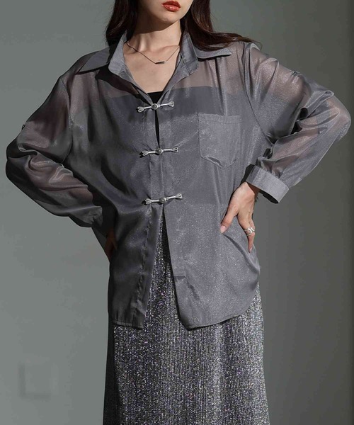 【アイテム】チャイナボタンがオリエンタルな雰囲気を醸し出すシアーシャツです。季節の変わり目に重宝するシアーシャツはトップスとして、羽織りとして活躍すること間違いなし!袖丈が調整できるようになっているので夏の今から、秋まで長くお楽しみいただけます◎【シーン】お出かけ、旅行、ランチ、女子会、オフィス、お呼ばれに活躍します。【体型カバー】ゆったりとしたシルエットで二の腕、ウエスト、ヒップの体型カバーができます。【Sサイズスタッフ着用コメント/40代150cm】着丈はヒップが隠れるくらいです。袖は伸ばすと親指が隠れるくらいです。脇ぐりも身幅も余裕があり楽に着用できました。シアー感のあるさらりとした生地で肌触りよかったです。袖が折り返してボタンで留めることができるので長い期間着用できそうです。※お使いのディスプレイにより色味が異なって見える場合がございます。ご了承の上お買い求め下さい。※他のキャンペーンにより、期間中に価格が変動する場合があります。☆『お気に入り登録』でお得な情報がいっぱい☆■「商品のお気に入り登録」で再入荷通知や、在庫残り僅かの通知、セール通知も受け取ることができます。■「ブランドのお気に入り登録」で新商品や再入荷など、お得な情報を受け取ることができます!是非ご登録くださいね☆