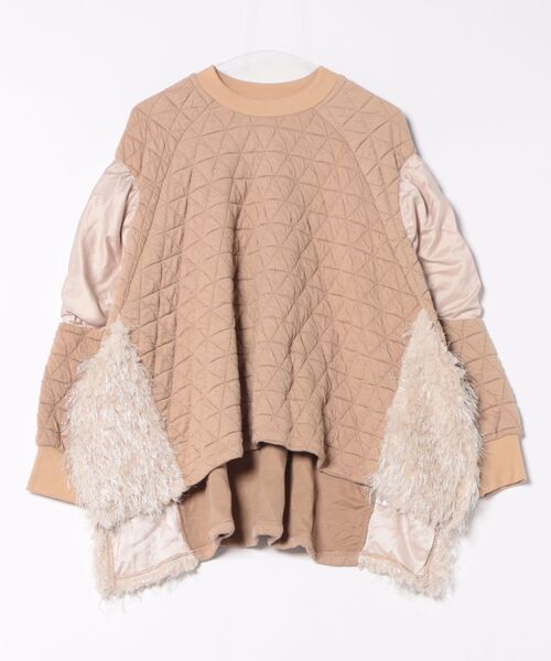 ふんわりとした素材感のニットキルトが着心地の良いドルマンキルトトレーナー。サークル部分は光沢感のあるサテン素材、サイドは毛足の長いボアフリンジで切り替え、存在感抜群の1枚に仕上げました。シーズンカラーの落ち着いたカーキと華やかなピンクのコントラストが際立つ注目のアイテムです。