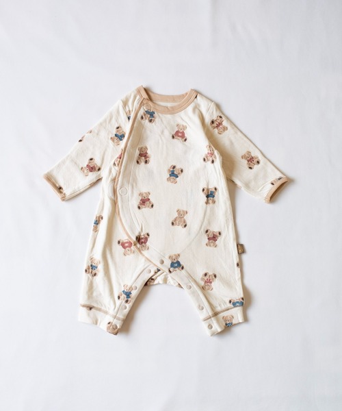 素朴な表情のテディベア達をプリントしたベビーウエアです。赤ちゃんの肌に優しく、ふんわり柔らかい肌触りの接結生地を使用。 さらっとした肌あたりなので、季節を問わず長いシーズンご着用いただけます。 ★親子のための工夫が詰め込まれたこだわりウエア ・ボタンの数を最小限に設定したお着替えかんたん仕様。 ・上身頃は面テープをペタッとくっつけるだけ。 赤ちゃんの成長や身体つきに合わせて、フィット感の調節もできます。 ・袖口は後ろのポケットをくるっと返すとミトンのように包めます。 冷えやすい指先の保温や、お顔のひっかき防止に。 ・股ぐりの配色ボタンでかけ間違いを防ぎます。 ・前身頃は2枚重ねなので、動き回ってもはだけずお腹を冷やしません。