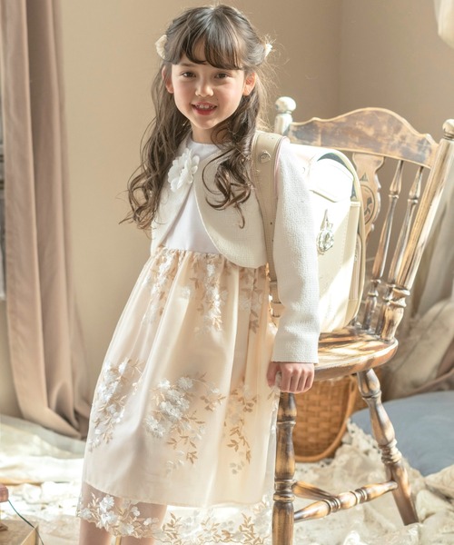 第一印象は上品&可憐に ドレスライクに華やぐワンピのセットアップ 花刺繍が可憐に揺れるワンピースが主役の 女の子入学式子供スーツセットアップ。 清楚感あふれる白いツイードボレロを合わせました。 リッチに映えるワンピースも、 作り自体はシンプルだから、 ドレスほど気負うことなく着られます。 ボレロと合わせて、上品な卒園式・入学式コーデ。 ワンピース単体で、またはカーディガンを合わせて 結婚式や発表会、パーティーなどオケージョンに。 パニエをはいてスカートにボリュームを持たせ、 ネックレスやヘッドドレスでコーデすれば、 ドレスさながらの華やかさに。 あらゆるシーンで可憐なスタイリングを楽しんで! ワンピース - 揺れる花刺繍のチュールスカートが、エレガントな印象を添えて - 身頃は白のシャンタン生地で切り替えたすっきりシンプルなデザイン ボレロ - 清楚なお嬢様感をあおる白ツイードのボレロには、上品な白いコサージュをあしらって - バックスタイルにはリボンのキュートなアクセント。縫い付けてあるので取り外しはできません 伸縮性:なし 生地の厚み:ワンピース薄手/ボレロ普通 透け感:ワンピーストップス部分は透け感ややあり ポケット:なし 裏地:なし ※背中のファスナー部分の縫いあわせについて 背中のファスナーが、ウエストの切り替えよりも10cmほど下から付けられているため、 スカートのチュールの縫い合わせ部分、裏地の縫い合わせ部分が、 ファスナーの部分だけ開けられた状態になっております。 なお、開いた部分のチュールについては、布の端処理が十分にされておりませんが、 ご了承の上お買い求め下さい。 ※刺繍入りチュール生地について 生地の特性上、刺繍糸が飛び出している場合がありますが、生地の不良ではございません。 糸を指でつまみ、ほつれてこないことを確認したら、飛び出している糸をはさみでカットしてください。 ★★★注)スーツのワンピースのお手入れについて ※非常に繊細な生地を使用しています。ご自宅でのお手入れをお勧めいたします。 特にチュールレースは、クリーニングの溶剤で損傷してしまうため、クリーニングには決して出さないで下さい。 (洗濯表示の通りにお手入れいただいた場合でも、生地に損傷が生じる場合がございます。) ご自宅の通常の洗濯洗剤で、手洗いの後、脱水をかけずに、そのまま干していただくときれいになります。 ご友人に貸すなどの際にも、クリーニングをしないよう重ねてご注意ください。 ※モデル画像は実際の商品と色合いが異なります。 実際の色合いは商品単体画像をご覧下さい。 ※商品の素材や色合いなど、生産時期によって差異が生じます。