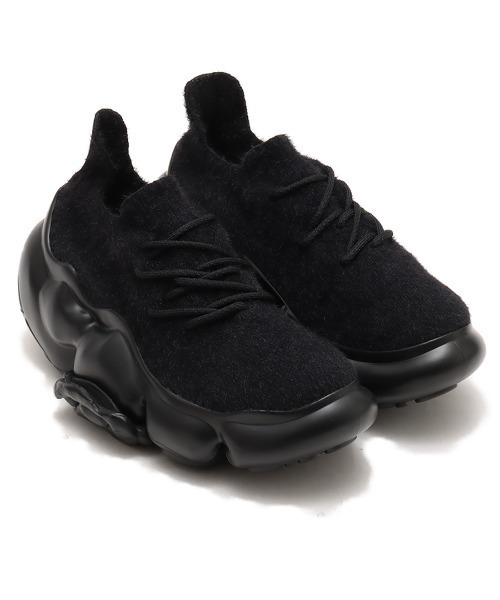 巨大なジェル状の何かを踏んでしまったようなフットウェア 本来、体全体を支えるため頑丈であるべきはずのアウトソールを、あえて流動的で柔らかそうな形状にしてしまったところが遊び心をくすぐるデザイン。 外側につけたラバーパーツがデザインにアクセントを加えている。 アッパーはボリュームのある靴底とは対照的に華奢な仕上がりとなっている。 シャープなシェイプと、土踏まずに作ったくびれ、つま先からかかとにかけて緩やかな傾斜をつけることで既存のスニーカーにはない上品でスラっとしたスタイルを印象づける。 アッパーはミドルカットのニット。無駄なパーツを排除しシンプルに仕上げてた。足首の部分はリブになっており、適度なホールド感がありながらも着脱しやすいデザインになっている。 ヒールの高さはおよそ7cm。 厚底でありながらも、靴底全体で体を支え、適度なクッション性を持たせることで、歩き疲れにくいように設計されている。 品番 : mph-001-bk-bk _______________________________________________________ お気に入り登録して最新情報を手に入れよう! ・商品のお気に入り登録 お気に入りアイテムの在庫ラスト1点、再入荷、セールなど商品情報をお届け ・ショップ・ブランドのお気に入り登録 ショップ限定商品や新商品などの最新情報をお届け _______________________________________________________